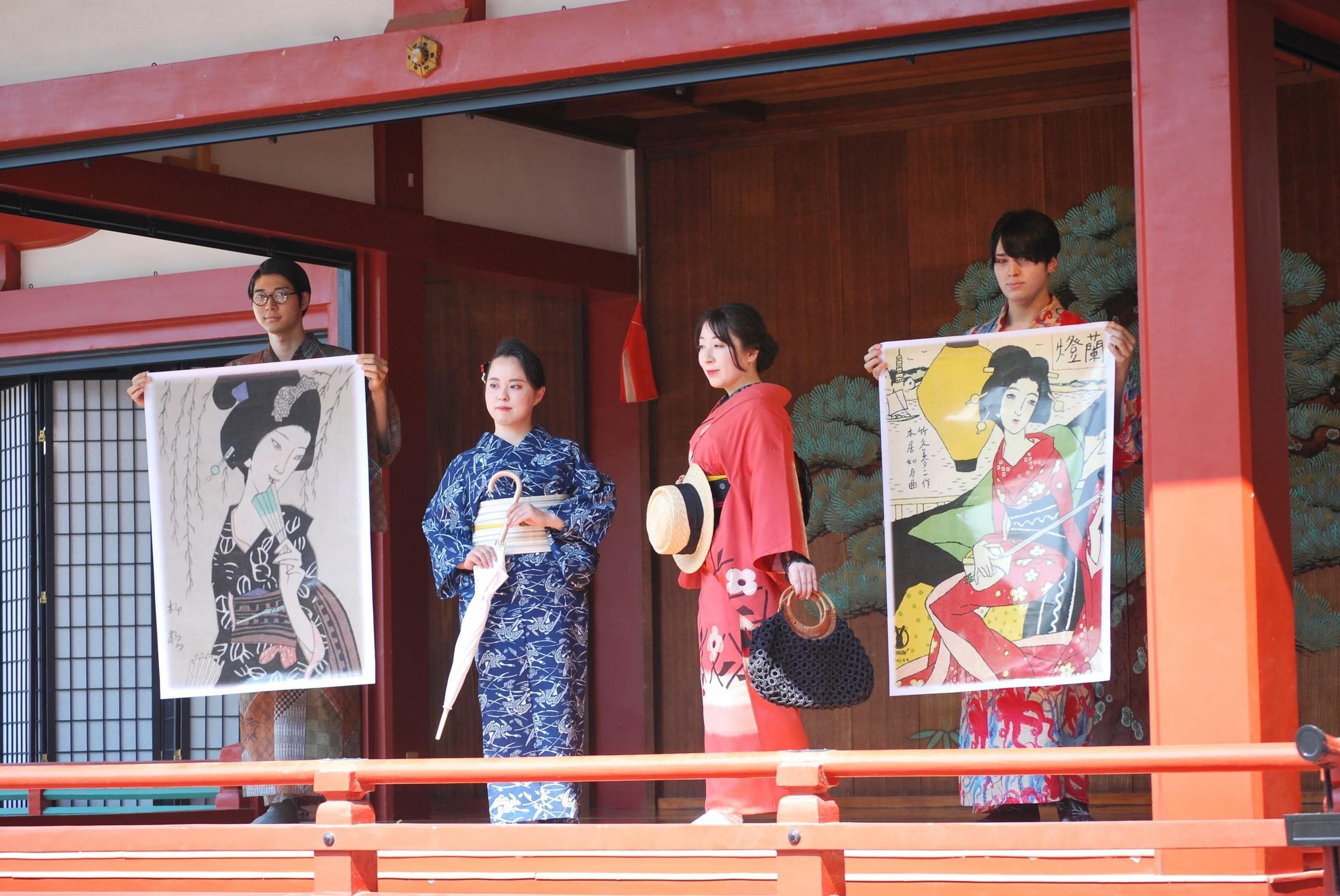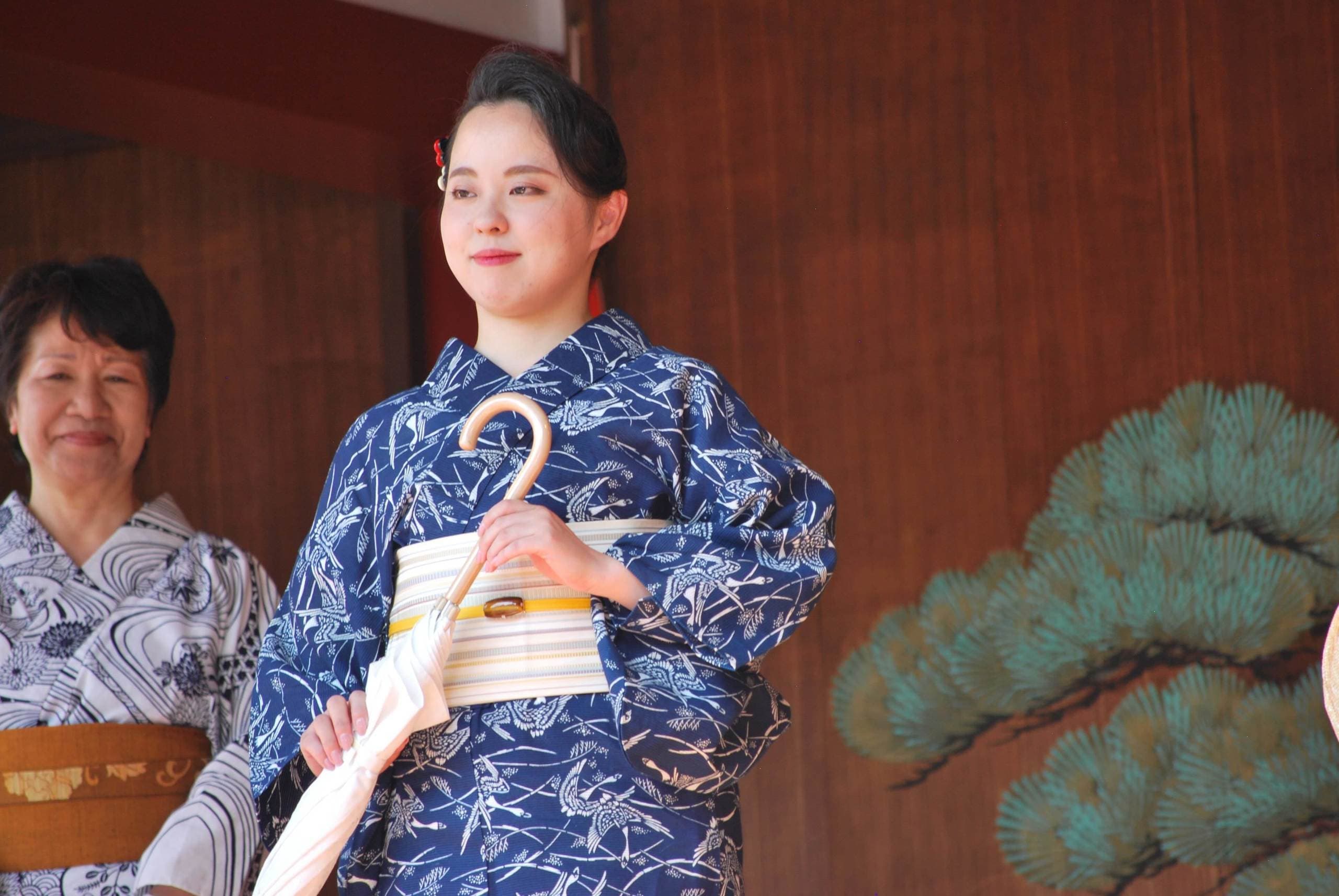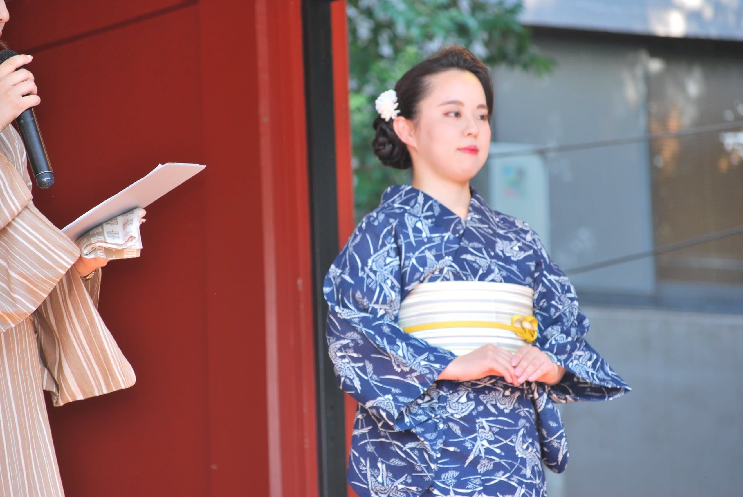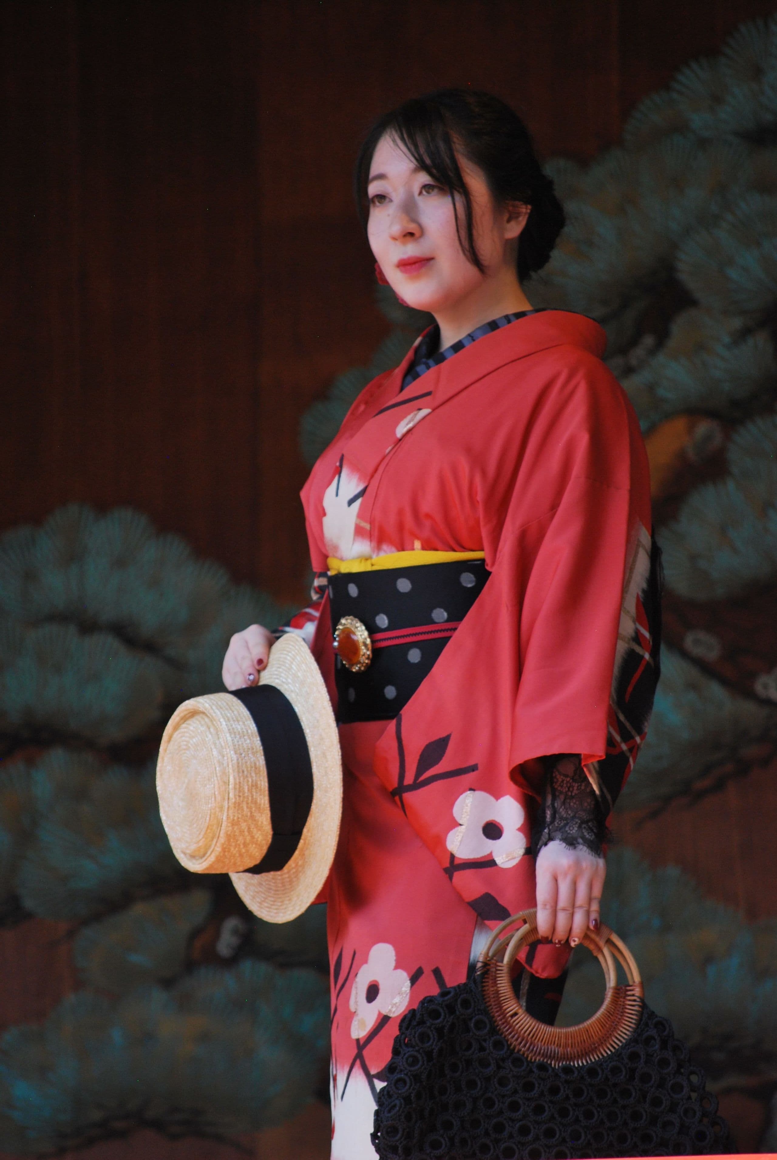 トップページ | ゆかたコンテスト | 貴方もすぐ夢二美女になれる 第二部 Part1 織田きもの専門学校トークショー 「貴方もすぐ夢二美女になれる」 前のページへ | 1 | 2 | 3 | 4 | 次のページへ 全てのコンテスト出場者が終わり、審査結果が発表されるまでの間に織田きもの専門学校の卒業生・在校生によるトーク&ファッションショーが開催されました。 テーマは、「貴方もすぐ夢二美女になれる」です。お着物だけではなく、装飾するお飾りや小物もご用意いたしました。 ナビゲーターとして、明里ゆうこさんに詳しく解説をいただきます。 明里ゆうこInstagram 卒業生お二人にモデルをつとめていただきました。 モデルさんが、夢二スタイルになっていきます。 着付けの先生もお手伝いいただき、仕上げをしていただきます。 夢二スタイルになれる着こなしのポイントを解説してゆきます。 夢二スタイルらしい艶やかな着こなしになりました。 手に携えたカンカン帽が大正ロマンを引き立てます。 パラソルも当時は、西洋から入ってきていました。 完成した夢二美人を夢二スタイルの男性お二人がエスコートしてファッションショーへと続きます。 次はファッションショー 織田きもの専門学校案内