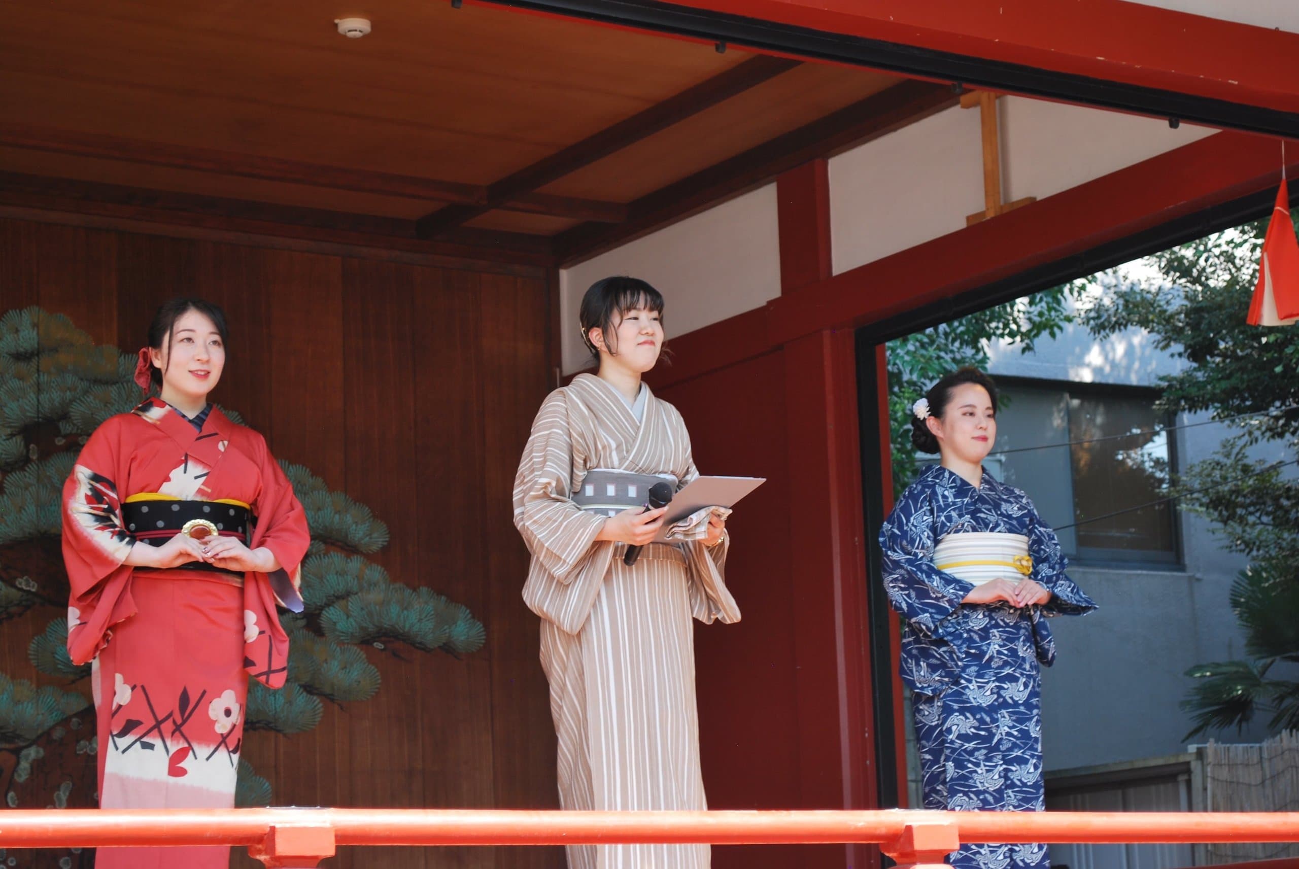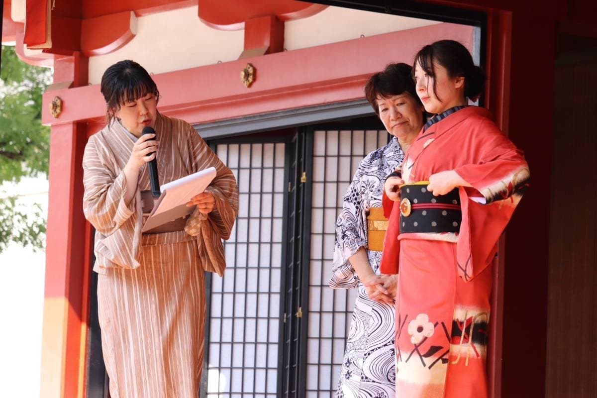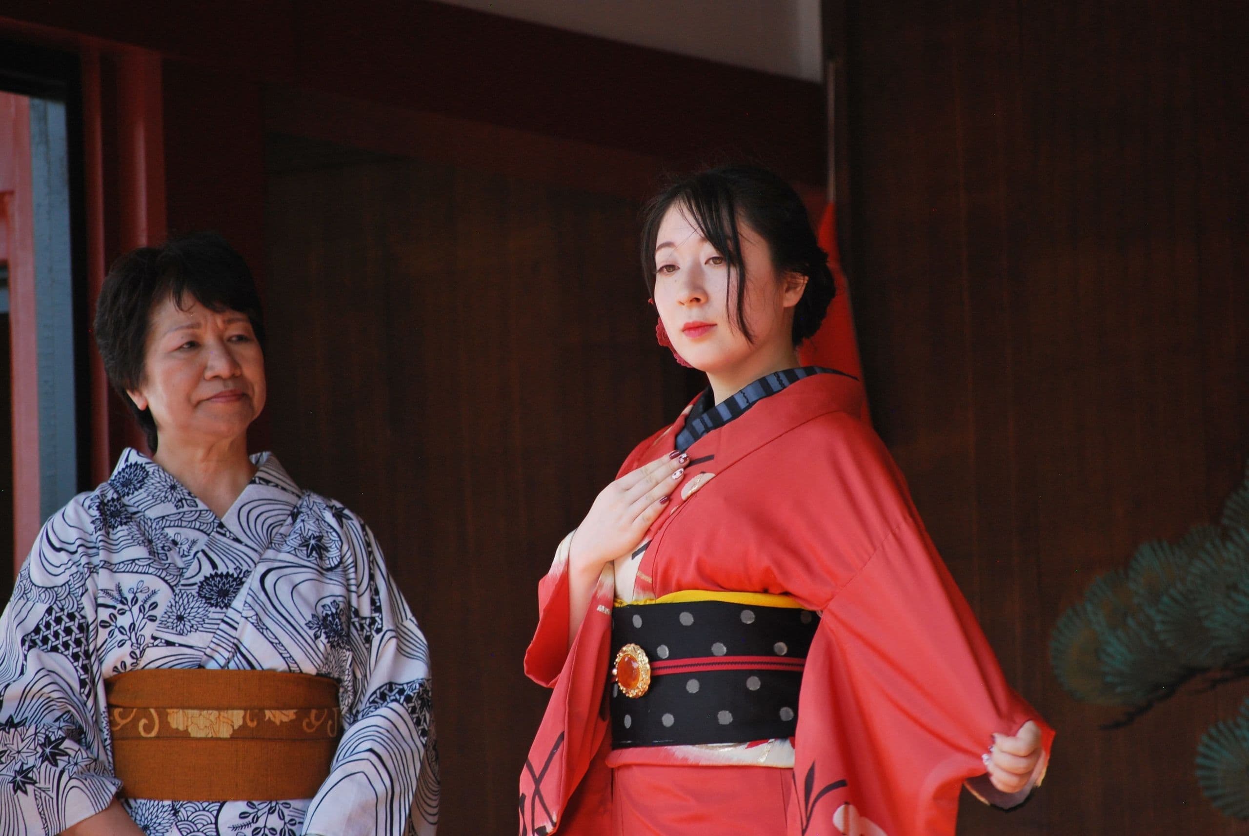 トップページ | ゆかたコンテスト | 貴方もすぐ夢二美女になれる 第二部 Part1 織田きもの専門学校トークショー 「貴方もすぐ夢二美女になれる」 前のページへ | 1 | 2 | 3 | 4 | 次のページへ 全てのコンテスト出場者が終わり、審査結果が発表されるまでの間に織田きもの専門学校の卒業生・在校生によるトーク&ファッションショーが開催されました。 テーマは、「貴方もすぐ夢二美女になれる」です。お着物だけではなく、装飾するお飾りや小物もご用意いたしました。 ナビゲーターとして、明里ゆうこさんに詳しく解説をいただきます。 明里ゆうこInstagram 卒業生お二人にモデルをつとめていただきました。 モデルさんが、夢二スタイルになっていきます。 着付けの先生もお手伝いいただき、仕上げをしていただきます。 夢二スタイルになれる着こなしのポイントを解説してゆきます。 夢二スタイルらしい艶やかな着こなしになりました。 手に携えたカンカン帽が大正ロマンを引き立てます。 パラソルも当時は、西洋から入ってきていました。 完成した夢二美人を夢二スタイルの男性お二人がエスコートしてファッションショーへと続きます。 次はファッションショー 織田きもの専門学校案内