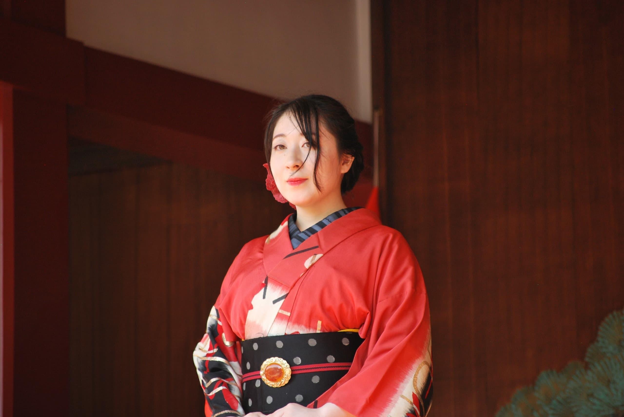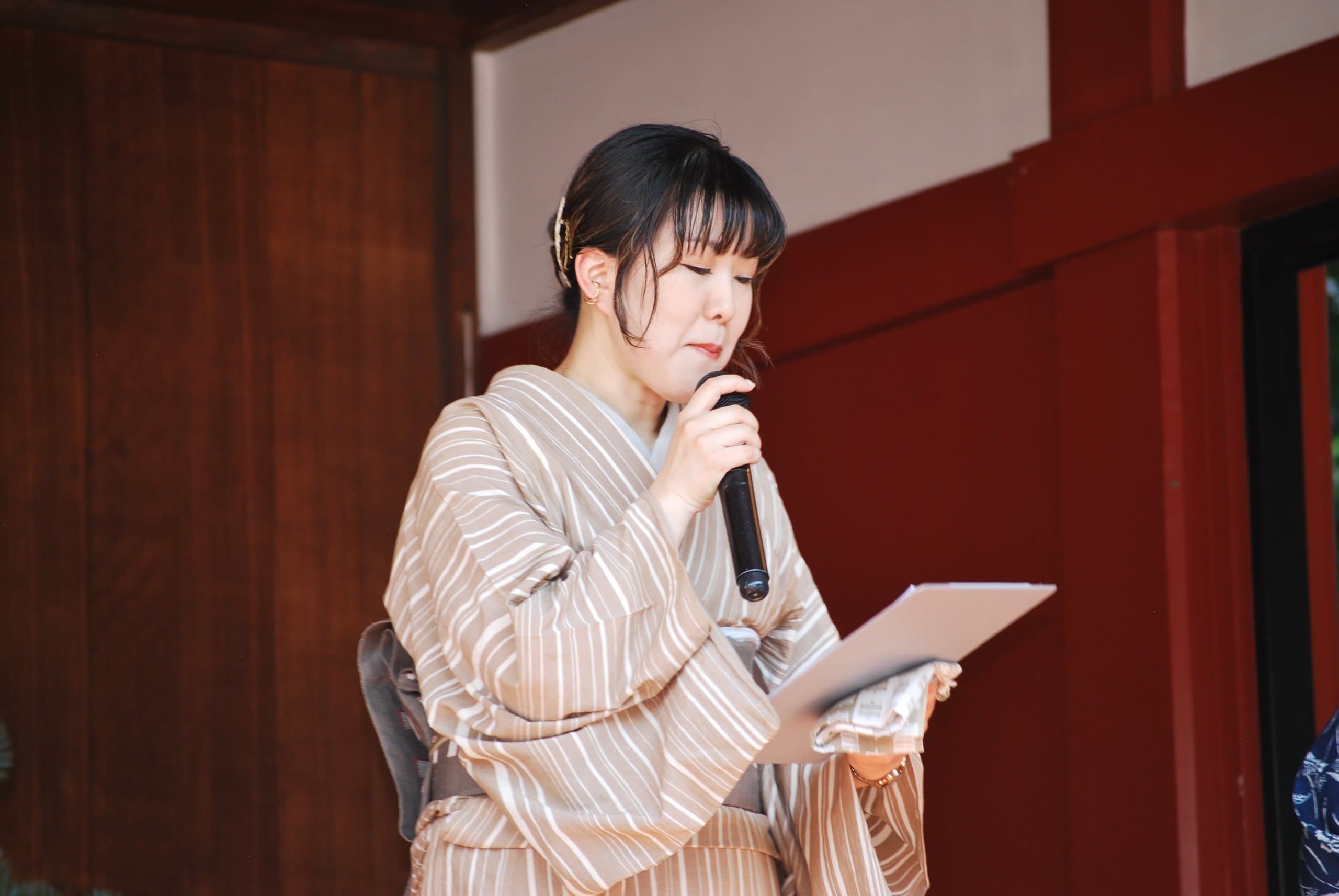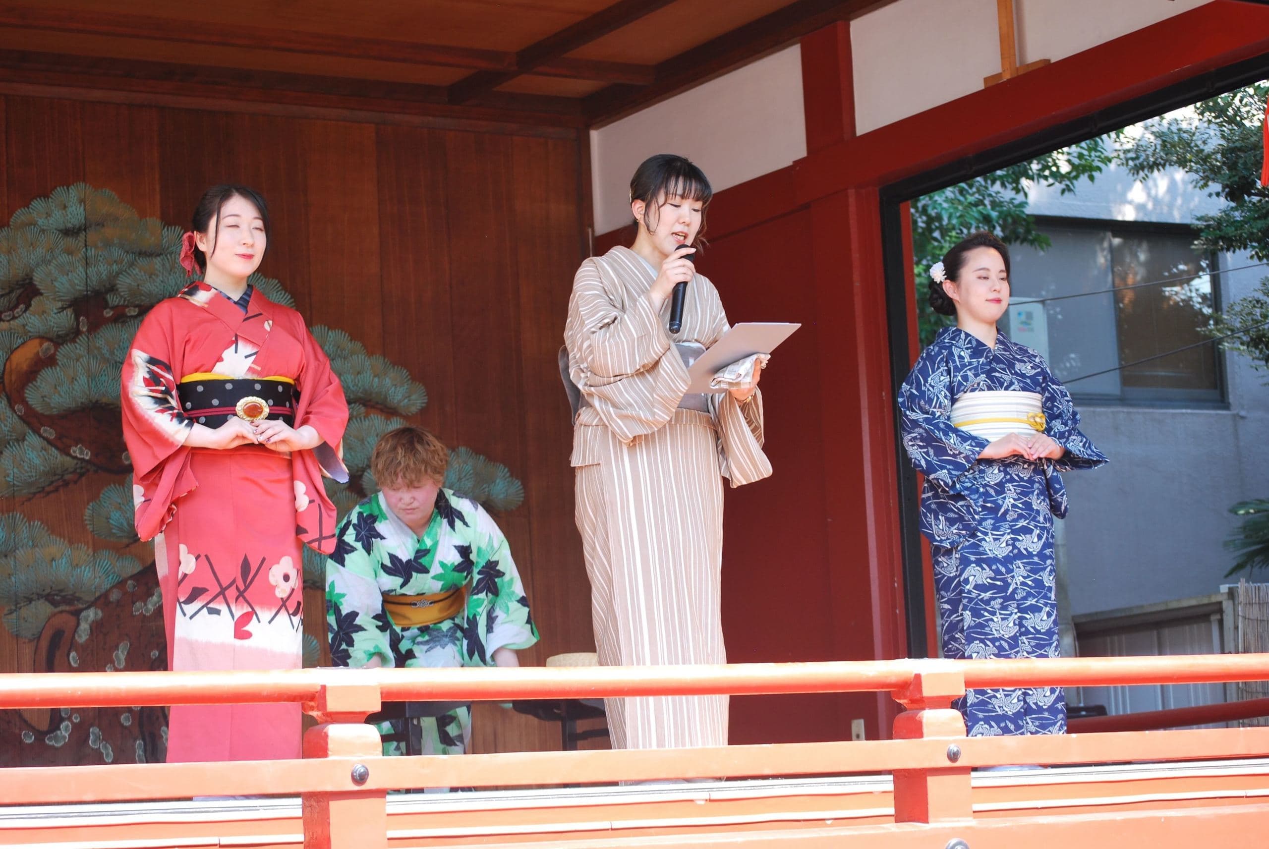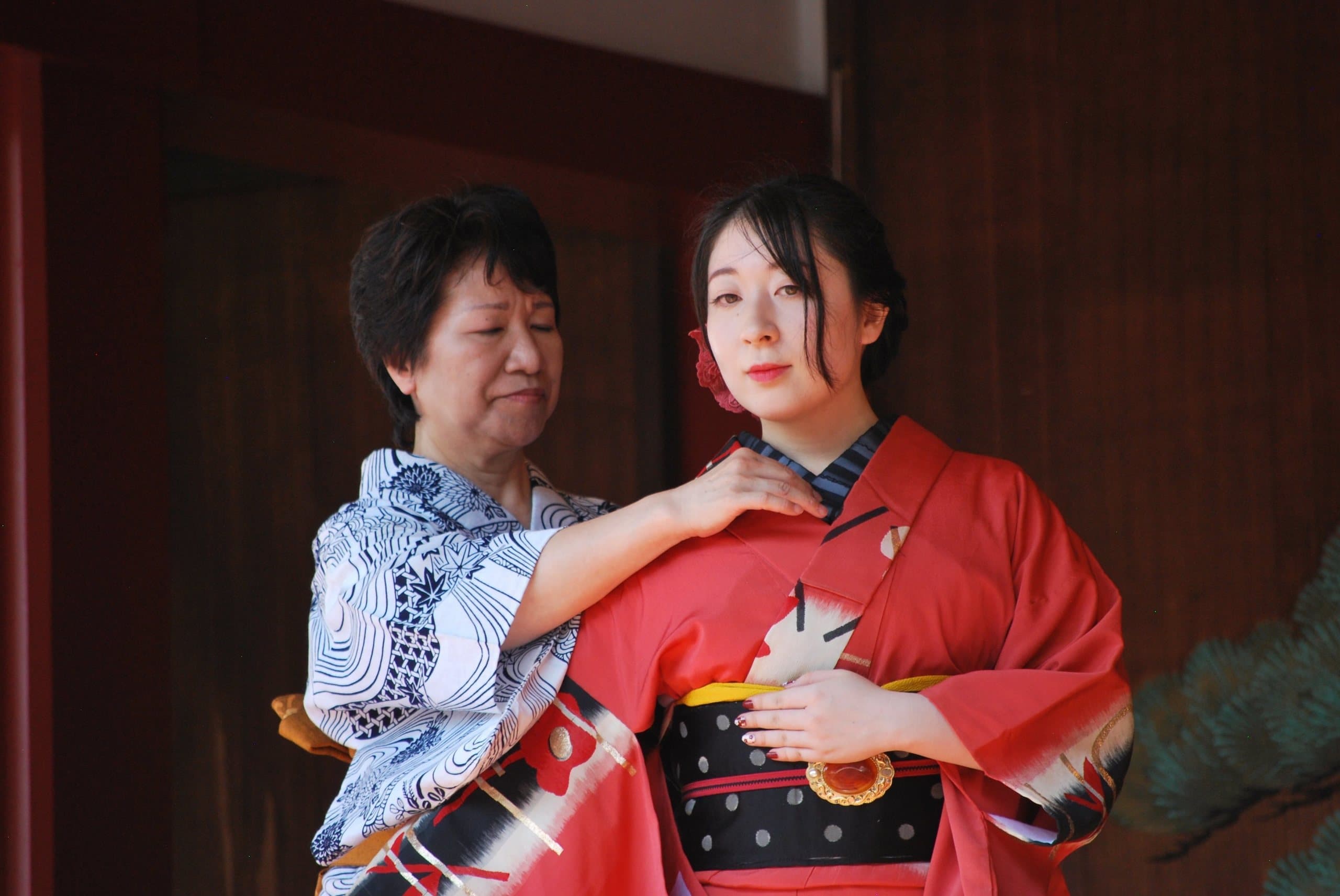 トップページ | ゆかたコンテスト | 貴方もすぐ夢二美女になれる 第二部 Part1 織田きもの専門学校トークショー 「貴方もすぐ夢二美女になれる」 前のページへ | 1 | 2 | 3 | 4 | 次のページへ 全てのコンテスト出場者が終わり、審査結果が発表されるまでの間に織田きもの専門学校の卒業生・在校生によるトーク&ファッションショーが開催されました。 テーマは、「貴方もすぐ夢二美女になれる」です。お着物だけではなく、装飾するお飾りや小物もご用意いたしました。 ナビゲーターとして、明里ゆうこさんに詳しく解説をいただきます。 明里ゆうこInstagram 卒業生お二人にモデルをつとめていただきました。 モデルさんが、夢二スタイルになっていきます。 着付けの先生もお手伝いいただき、仕上げをしていただきます。 夢二スタイルになれる着こなしのポイントを解説してゆきます。 夢二スタイルらしい艶やかな着こなしになりました。 手に携えたカンカン帽が大正ロマンを引き立てます。 パラソルも当時は、西洋から入ってきていました。 完成した夢二美人を夢二スタイルの男性お二人がエスコートしてファッションショーへと続きます。 次はファッションショー 織田きもの専門学校案内