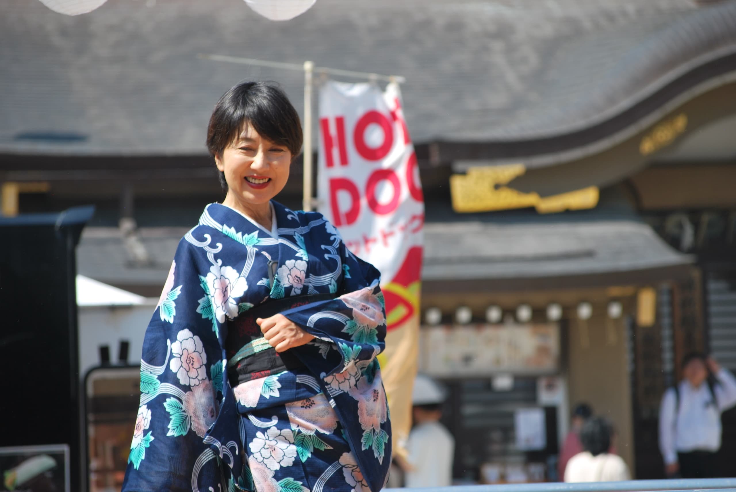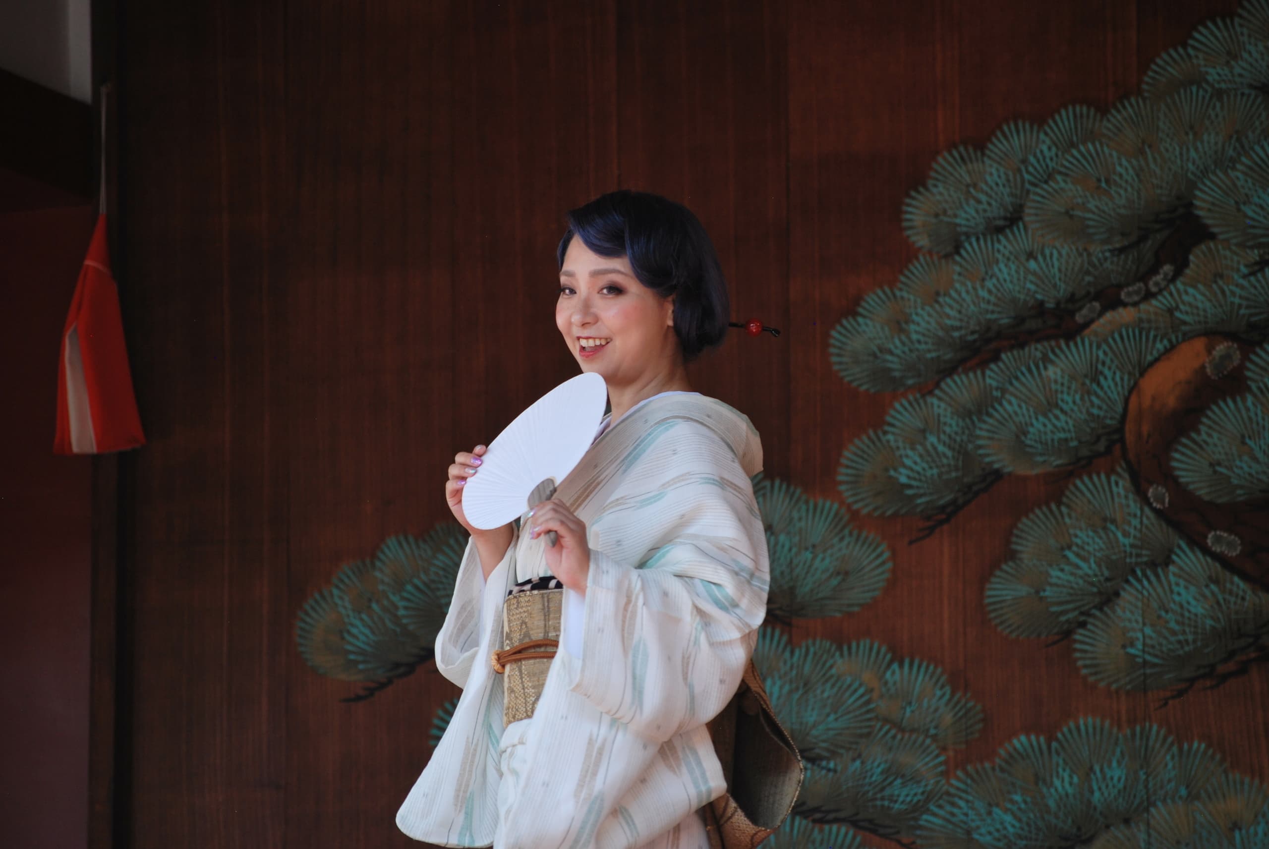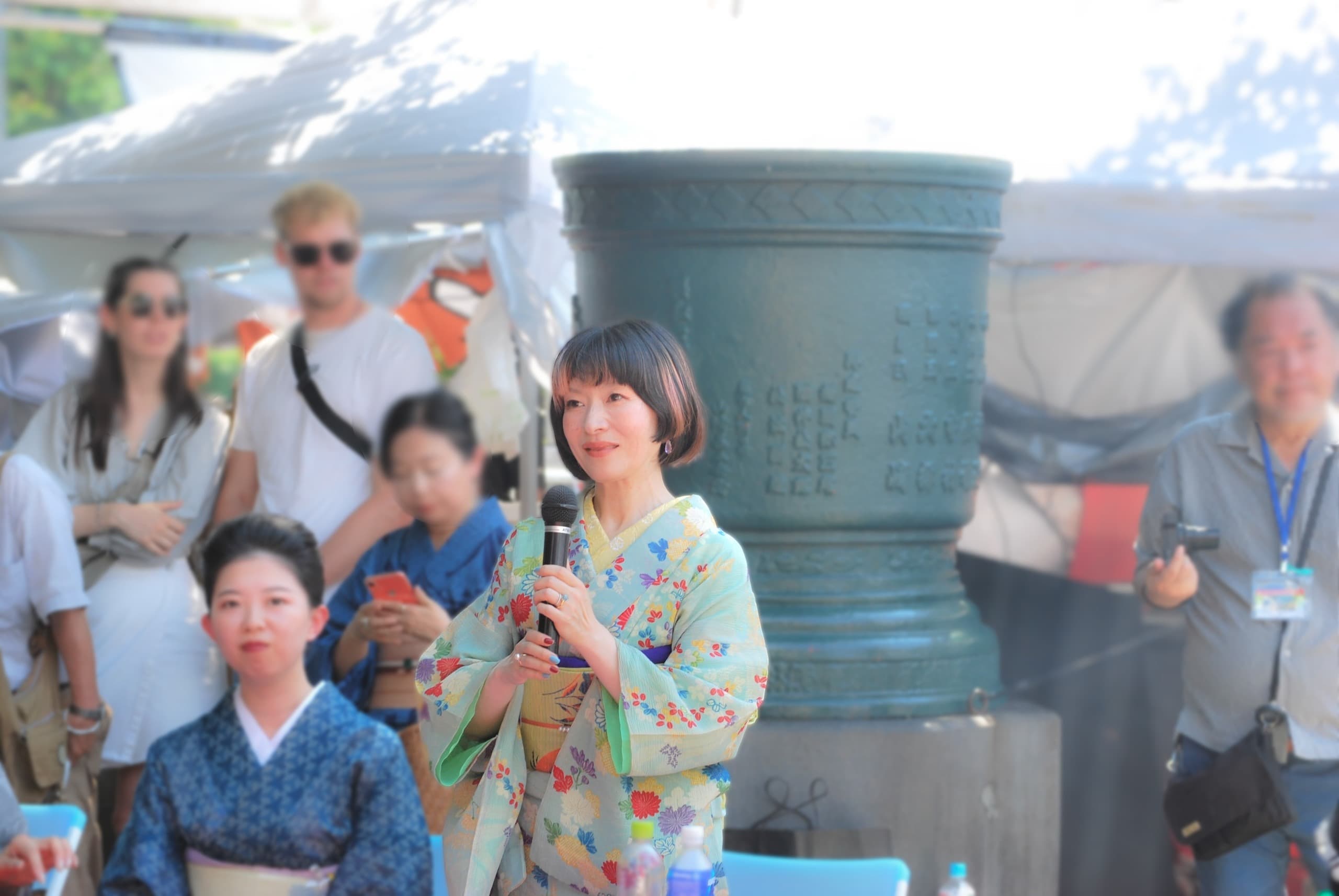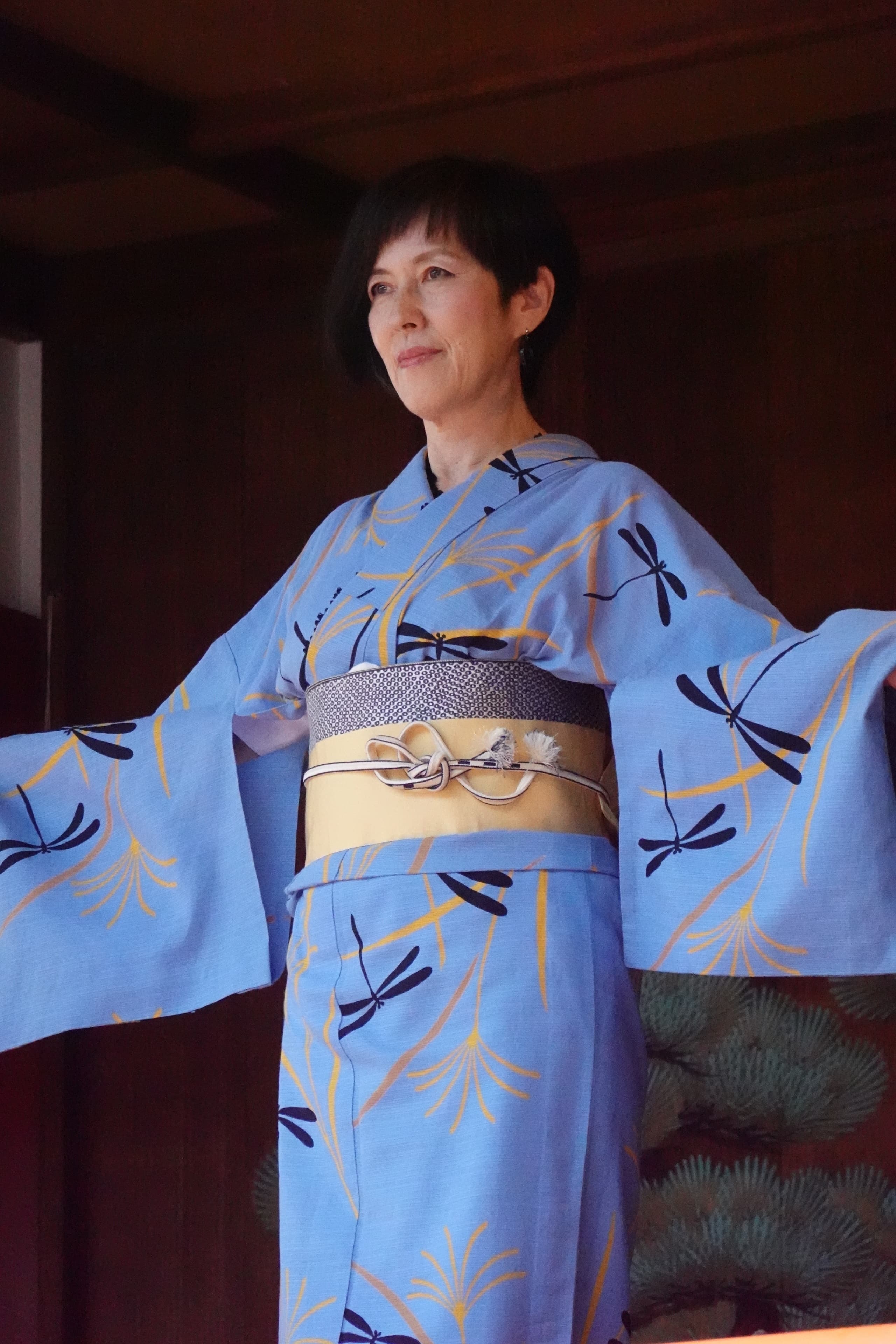 和文化の体験と学び講座「和の季(わのき)」を運営されているイワハシさん。コーディネートは夏の涼しさを表現しました。夏らしいモチーフや素材を重ね、視覚的な涼感を演出。帯は粋な銀座結びを採用し、二枚歯の下駄と合わせることで洗練された雰囲気を醸し出しています。特に後ろ姿は夢二の絵画を彷彿とさせる美しさです。夢二の世界観を現代的に解釈しつつ、涼やかさと粋を兼ね備えたスタイルをお楽しみください。