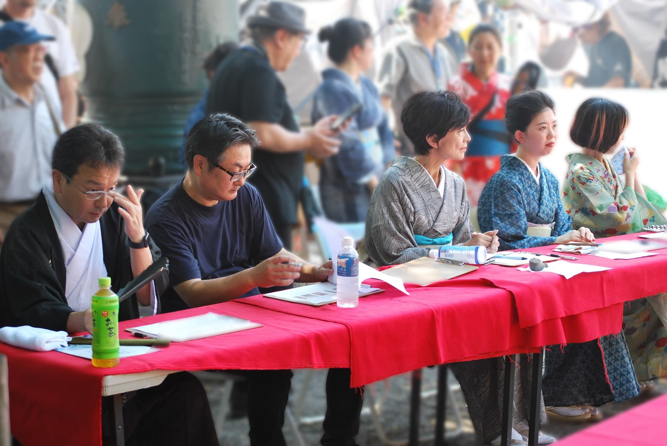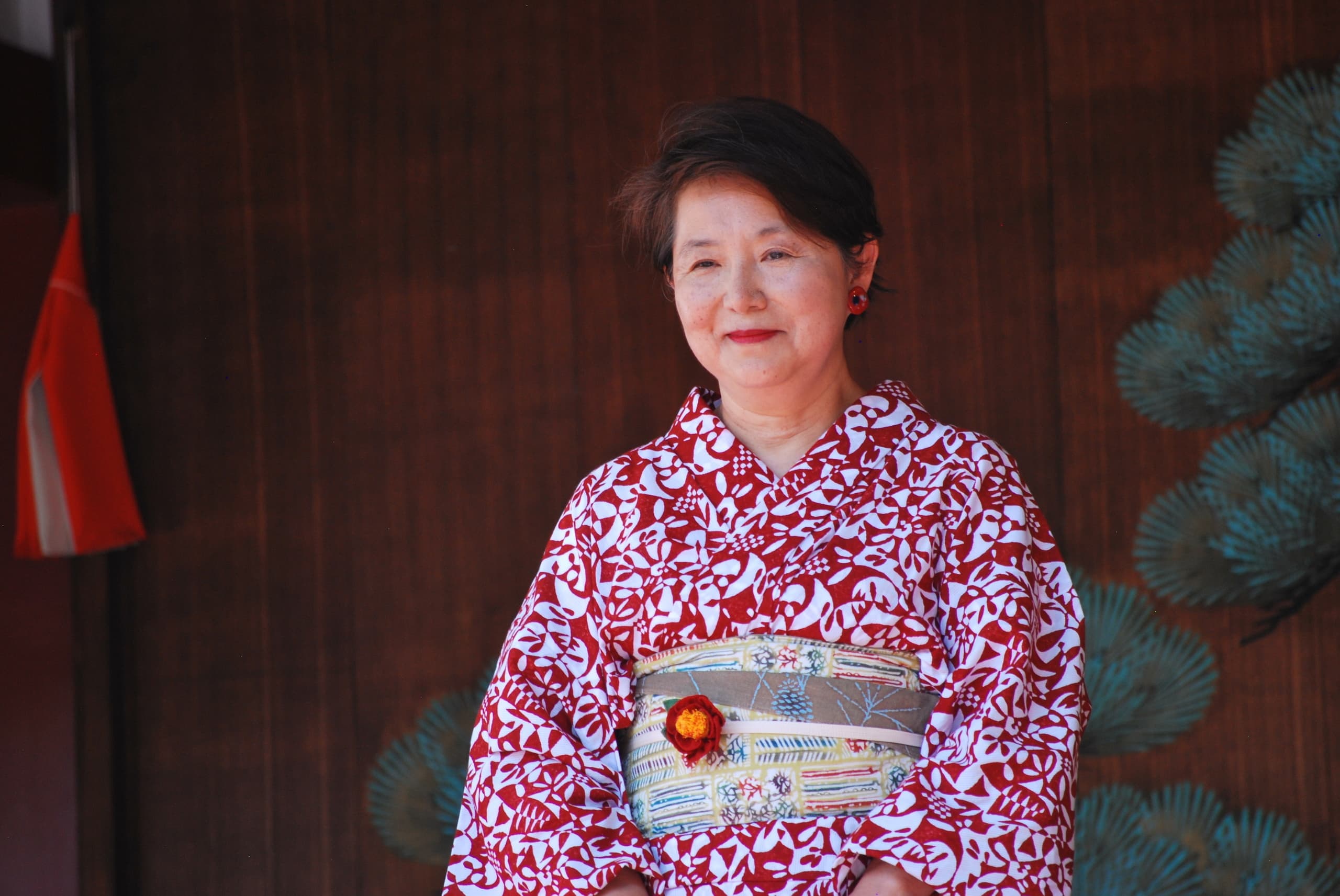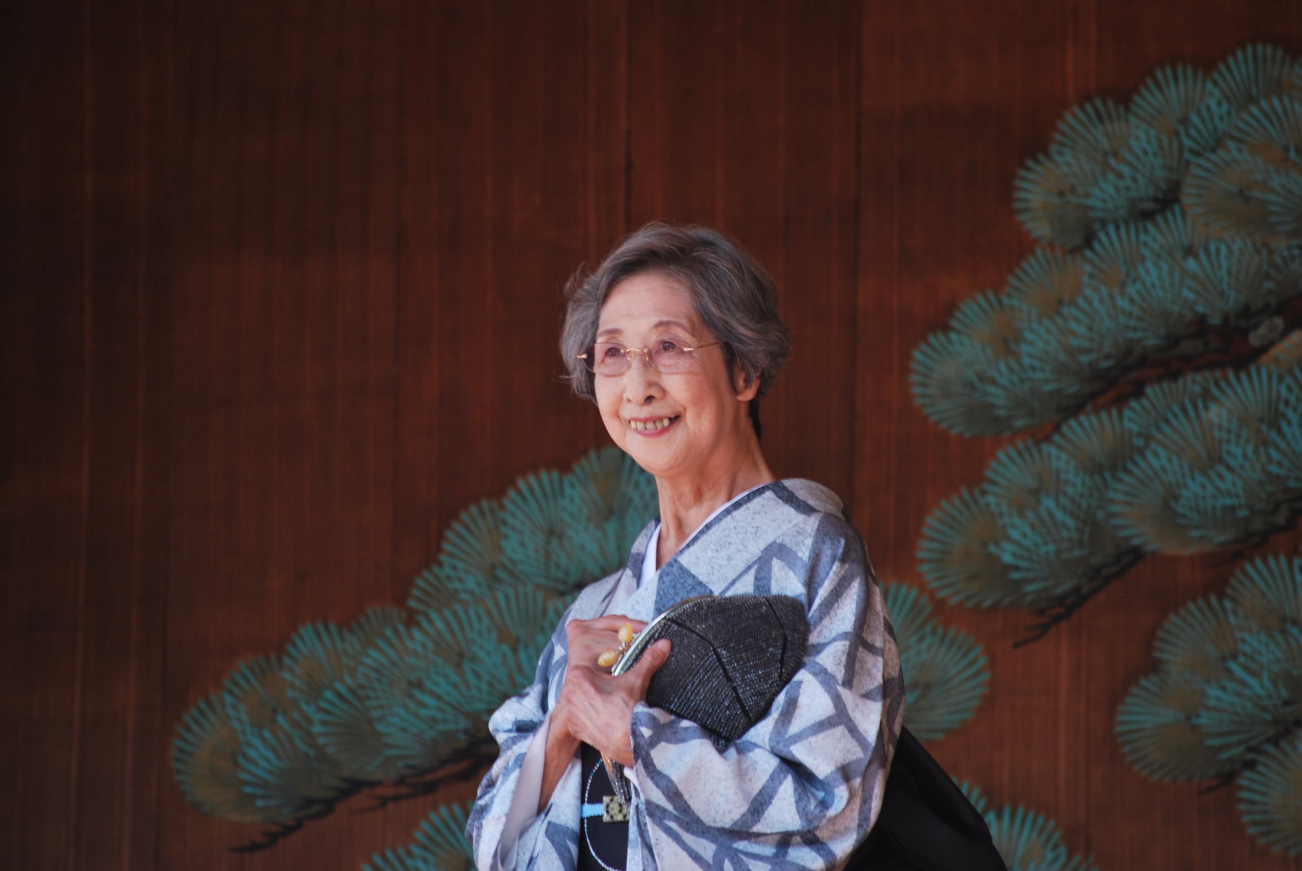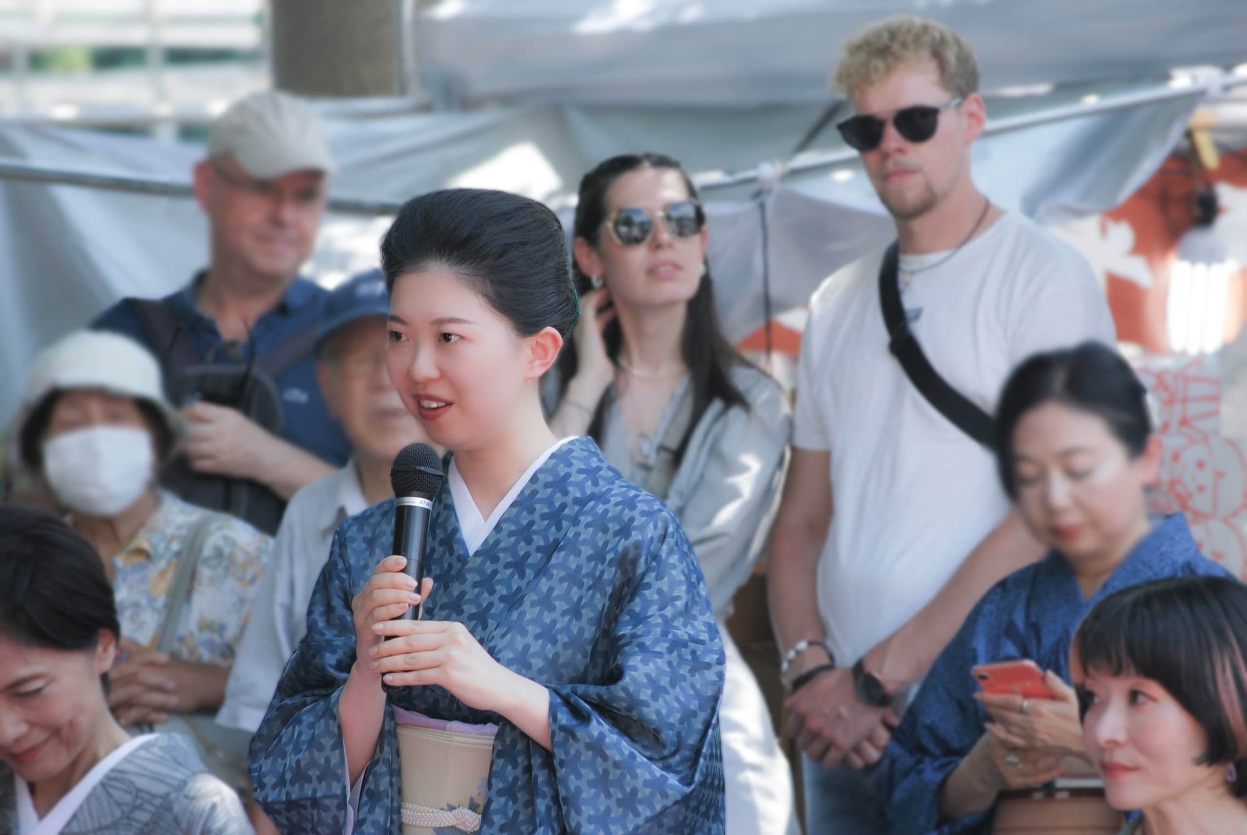和文化の体験と学び講座「和の季(わのき)」を運営されているイワハシさん。コーディネートは夏の涼しさを表現しました。夏らしいモチーフや素材を重ね、視覚的な涼感を演出。帯は粋な銀座結びを採用し、二枚歯の下駄と合わせることで洗練された雰囲気を醸し出しています。特に後ろ姿は夢二の絵画を彷彿とさせる美しさです。夢二の世界観を現代的に解釈しつつ、涼やかさと粋を兼ね備えたスタイルをお楽しみください。