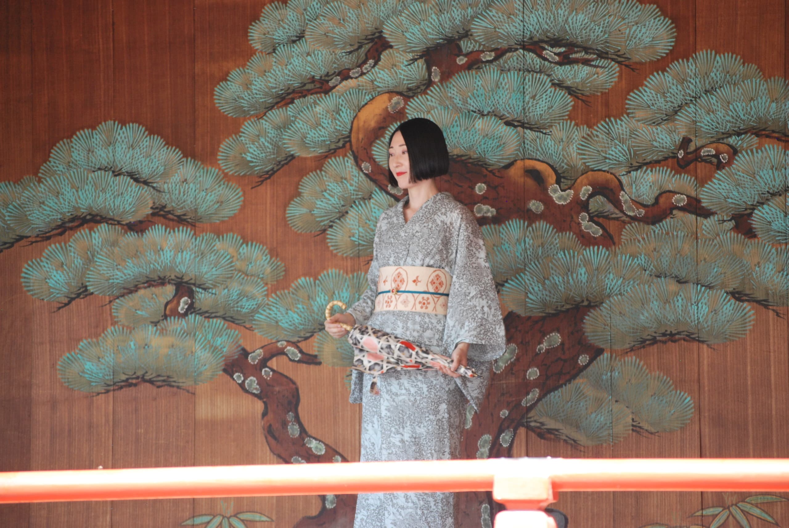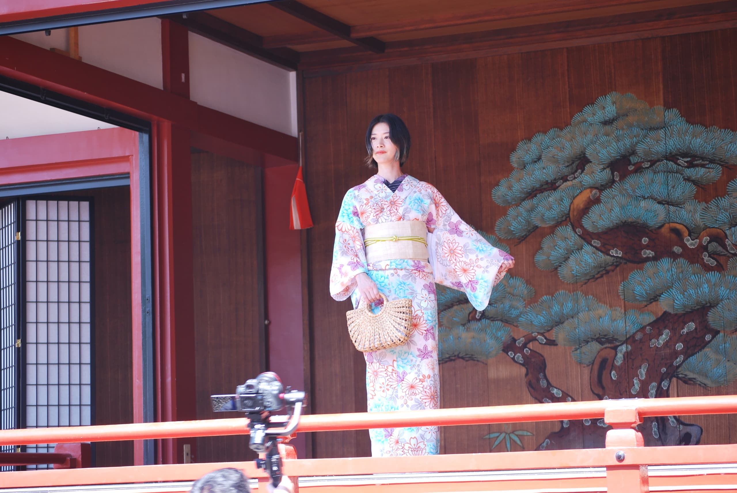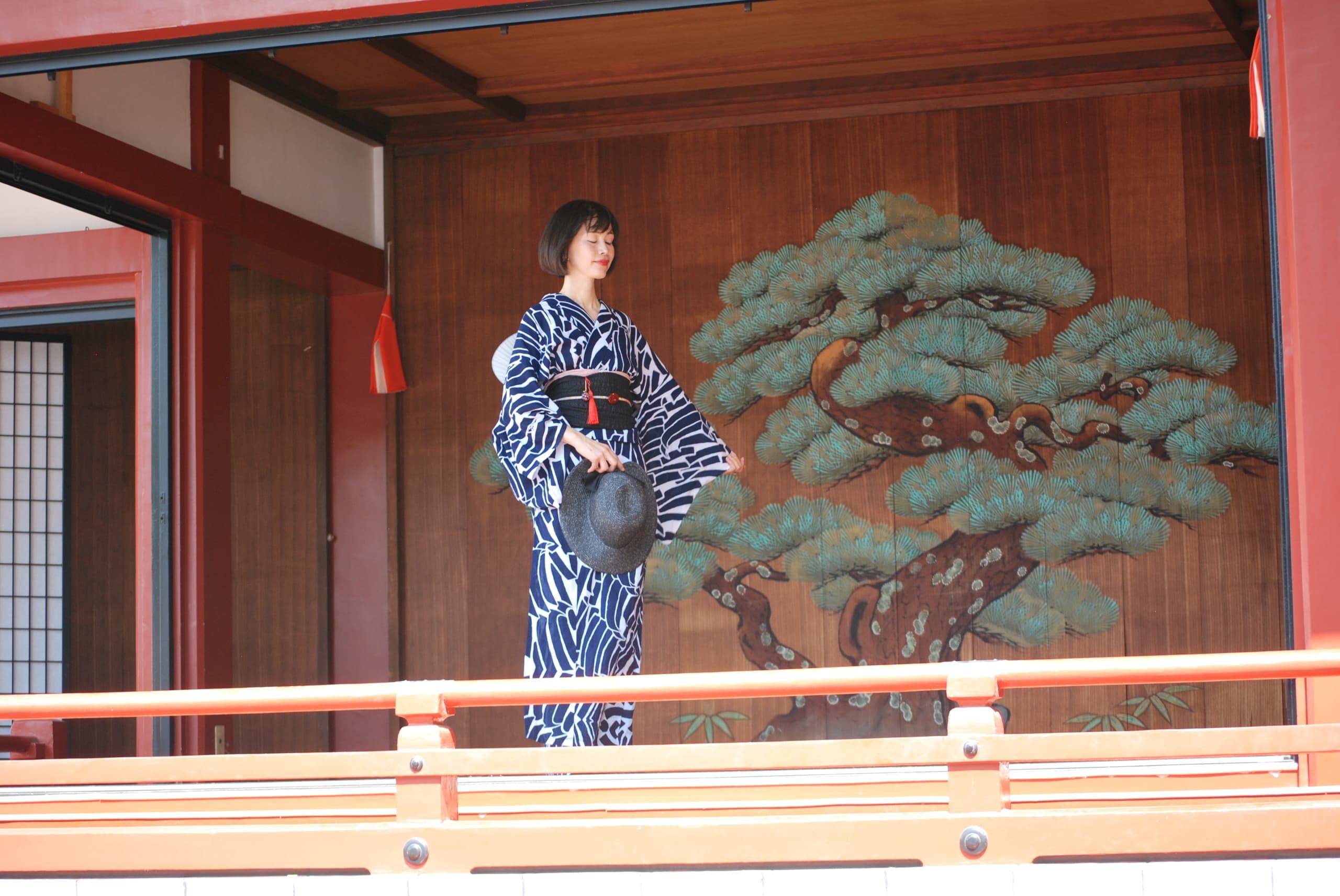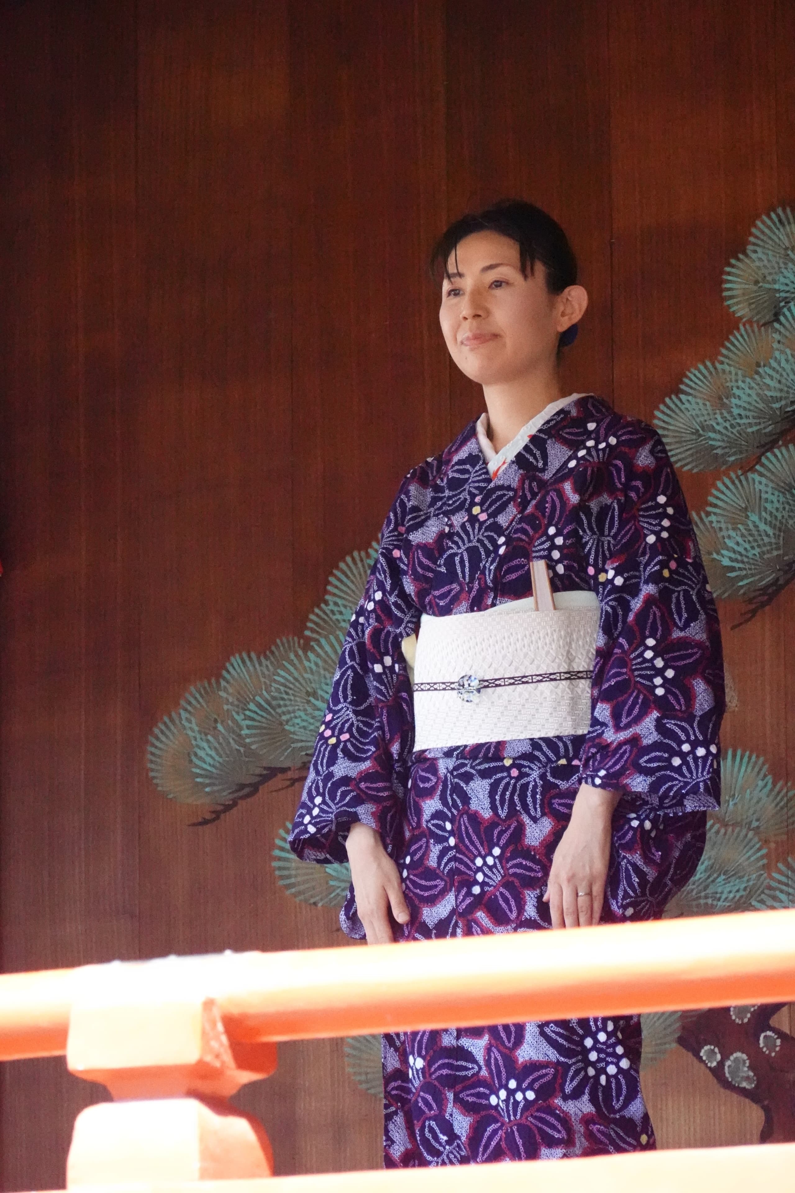 和文化プロモーターとして、和文化体験と学びの場「和の季(わのき)」を運営されています。今回のコーディネートは、夢二が愛した「アンニュイでいて時勢を受け止める包容力のある女性像」がテーマです。文明開化後の学び舎を思わせる三勝(さんかつ)の復刻柄の浴衣に、モダンさを引き立てる黒の帯を合わせました。大正ロマンの時代、必死に生きる女性のふとした物憂げな瞬間を、令和の世に表現したスタイルをご覧ください。
