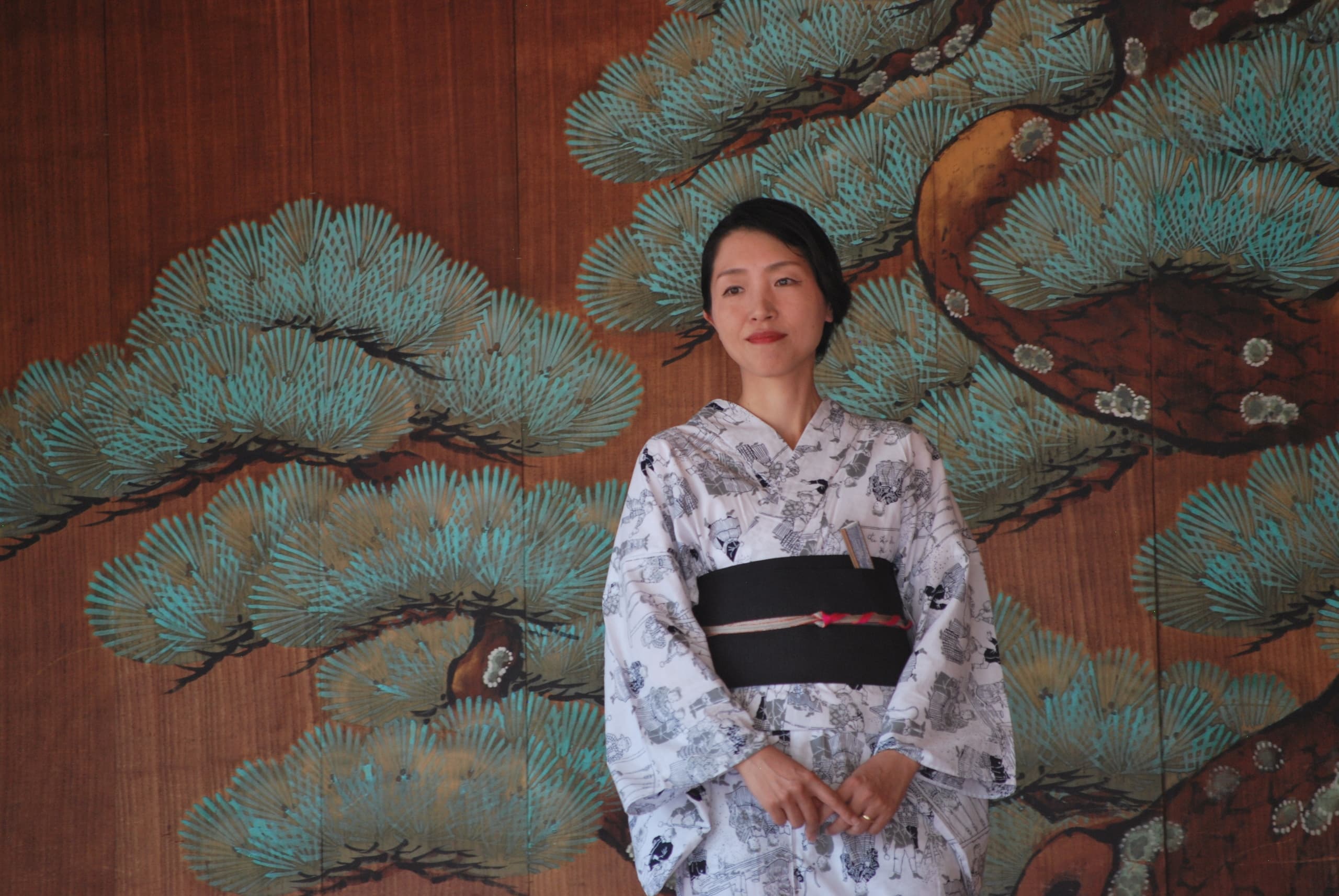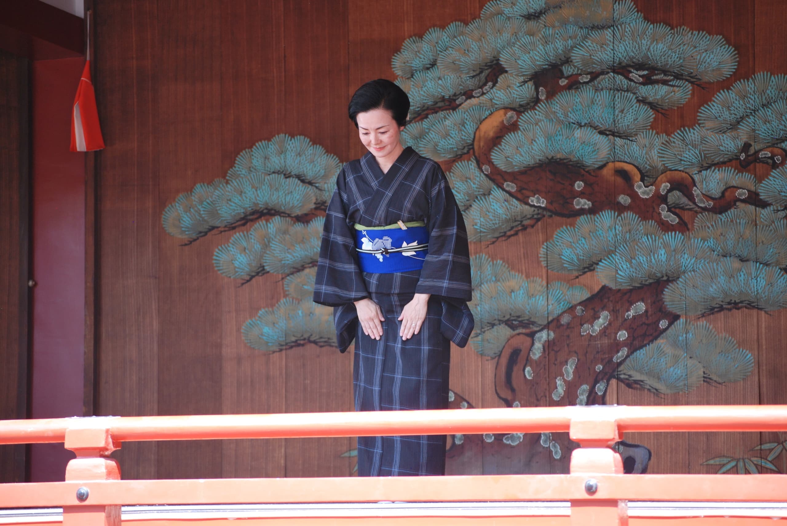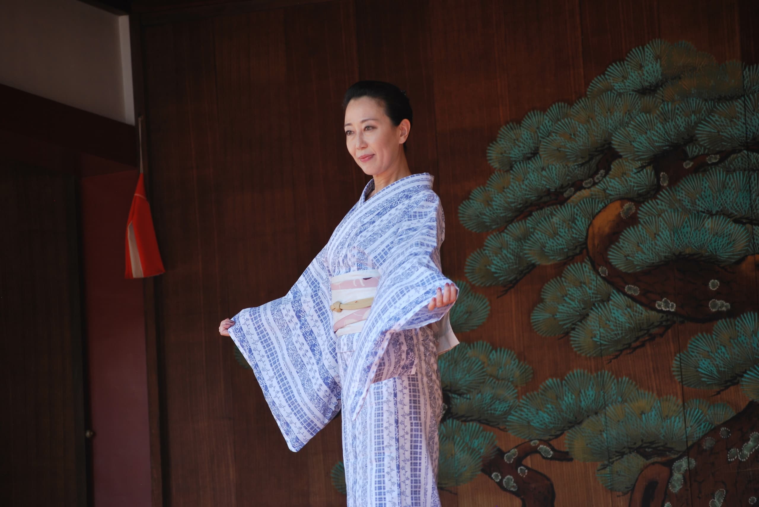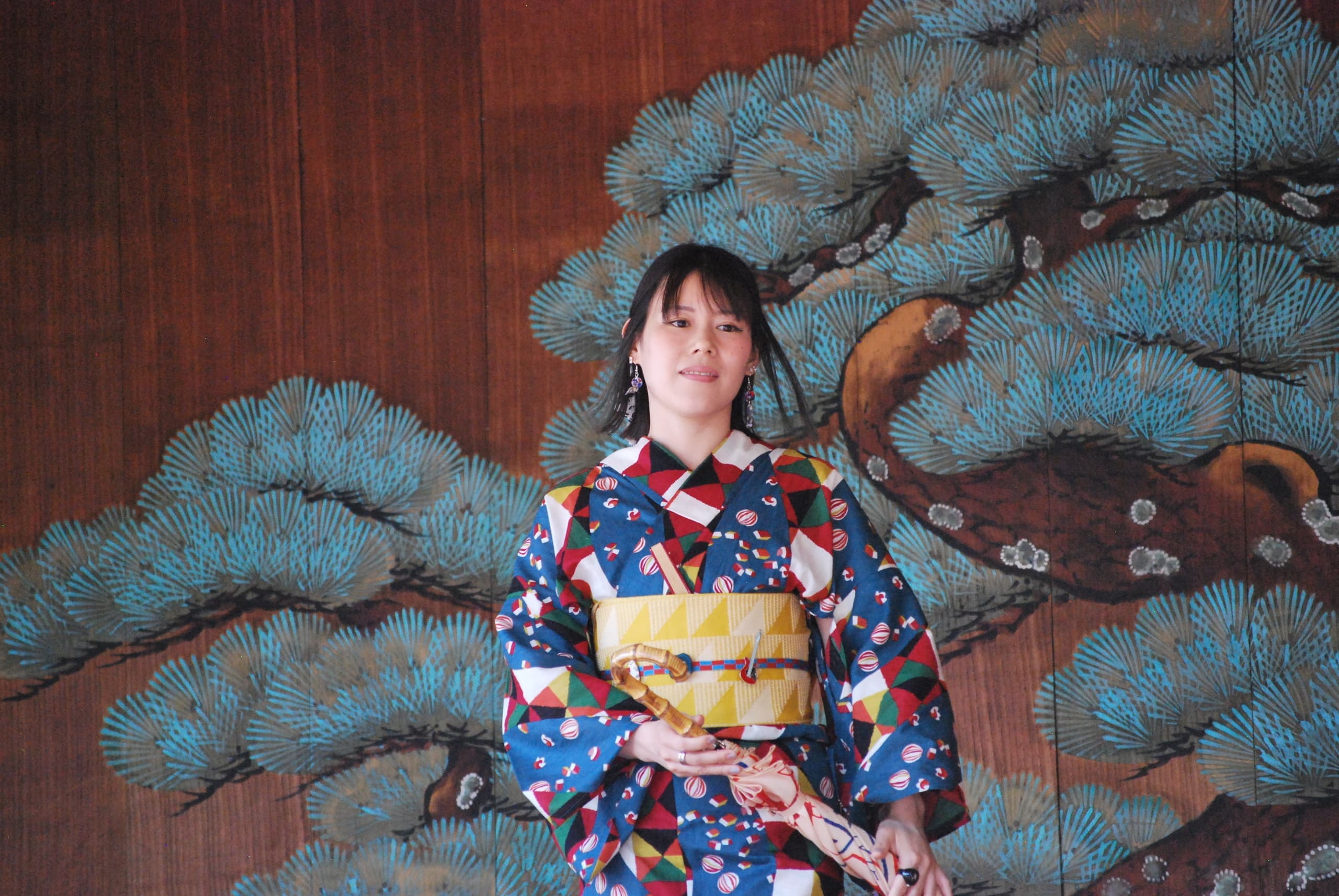 和文化プロモーターとして、和文化体験と学びの場「和の季(わのき)」を運営されています。今回のコーディネートは、夢二が愛した「アンニュイでいて時勢を受け止める包容力のある女性像」がテーマです。文明開化後の学び舎を思わせる三勝(さんかつ)の復刻柄の浴衣に、モダンさを引き立てる黒の帯を合わせました。大正ロマンの時代、必死に生きる女性のふとした物憂げな瞬間を、令和の世に表現したスタイルをご覧ください。