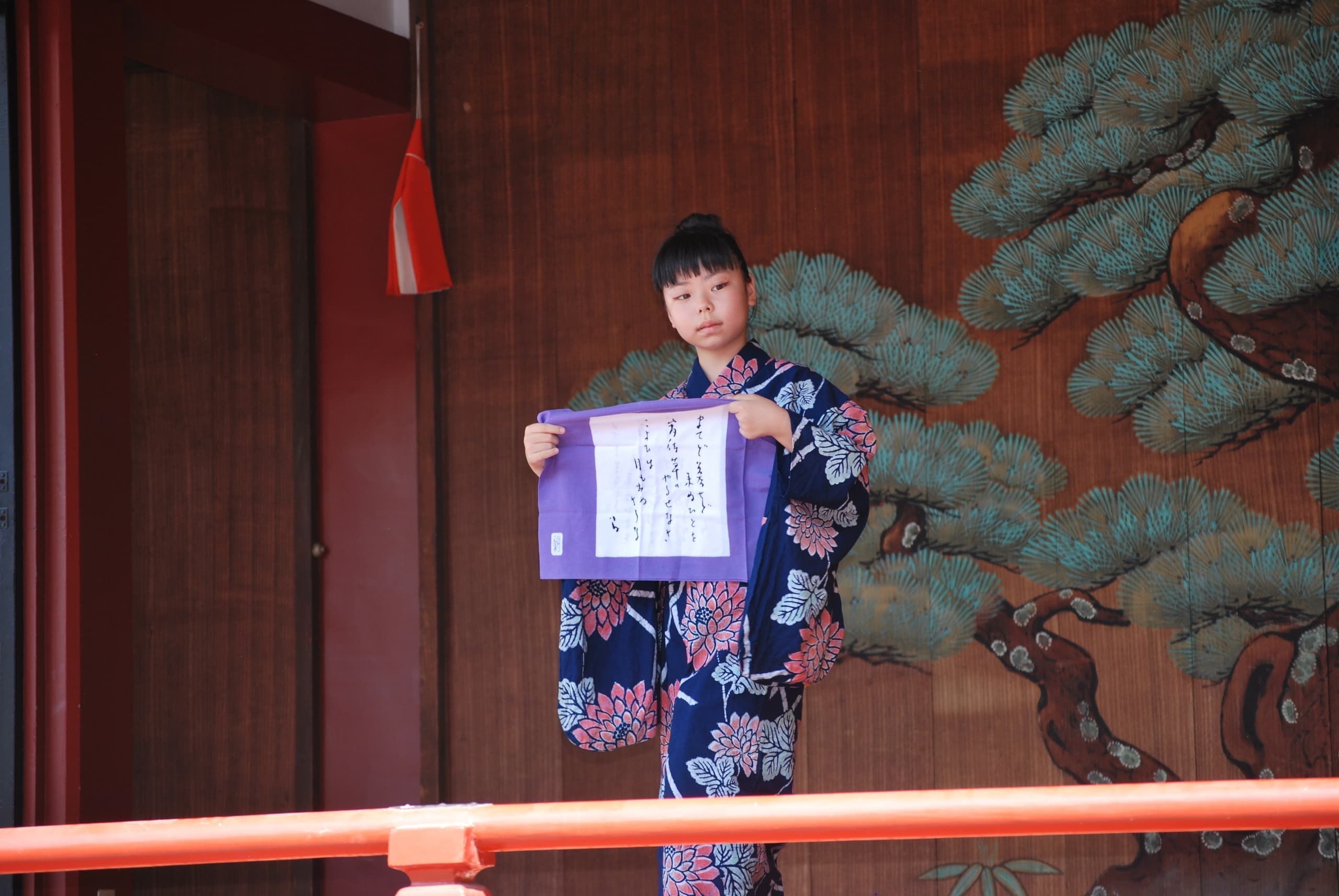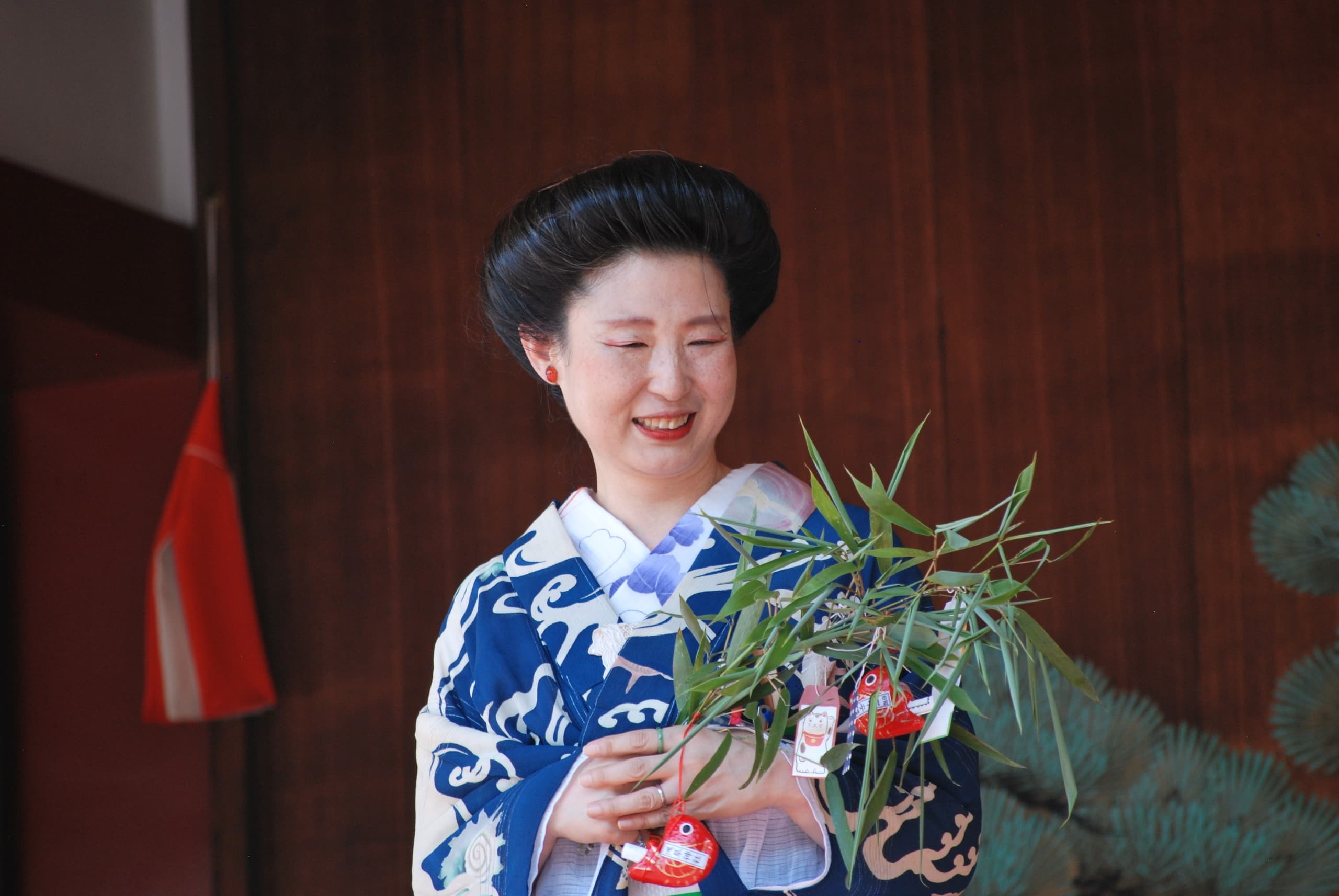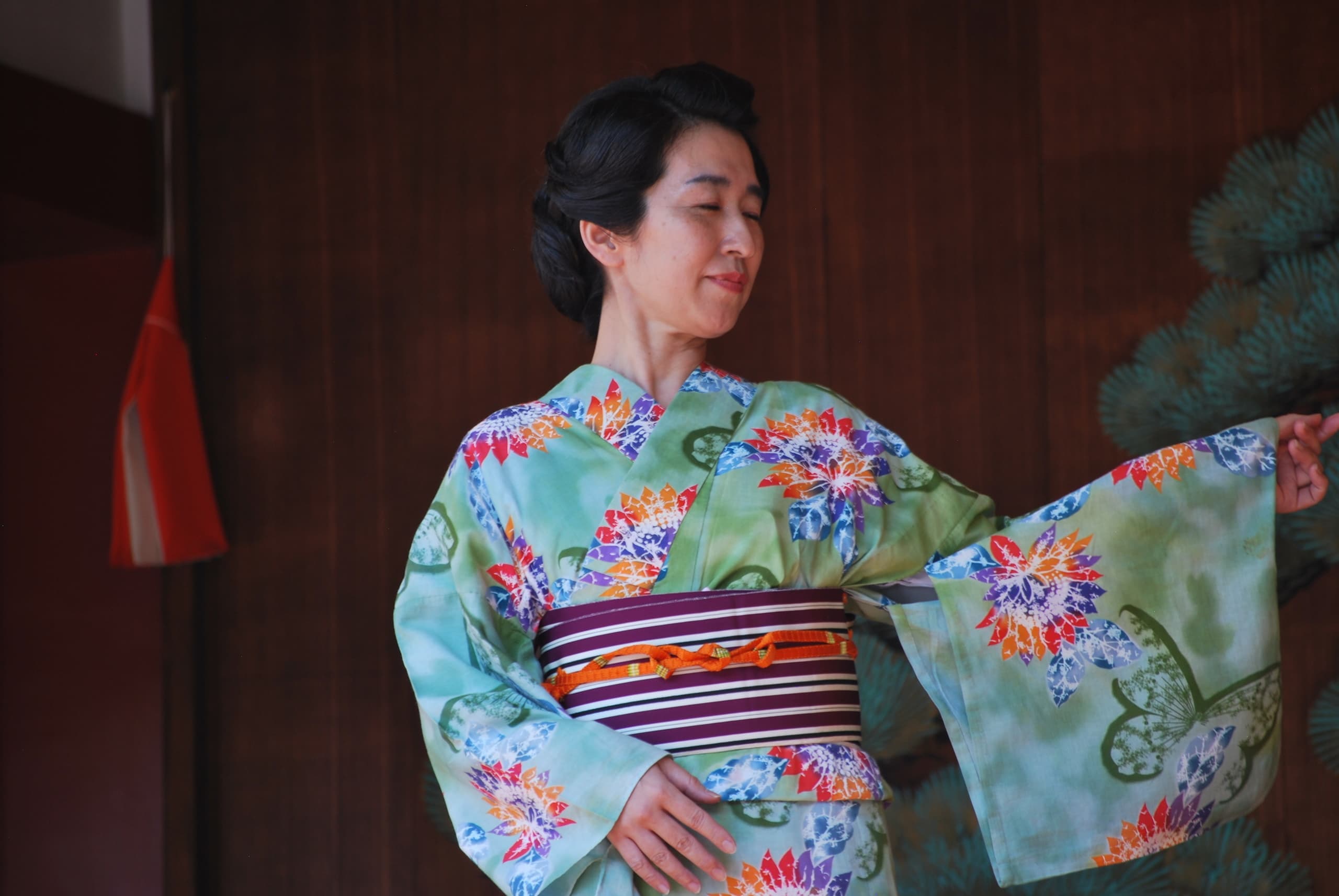 都内でシンガーとして活躍されているゆりえさんは、昔から和装が大好きで私服として着る憧れを持っていました。昨年から着物デビューを果たし、プライベートでも頻繁に着用しているそうです。今回の夢二スタイルでは、カルタに描かれた珍しくポップな柄からインスピレーションを得て、自分らしい色合いの浴衣を選んだそうです。夢二の古典的なイメージを越えた、新鮮で個性的な解釈をお楽しみください。
